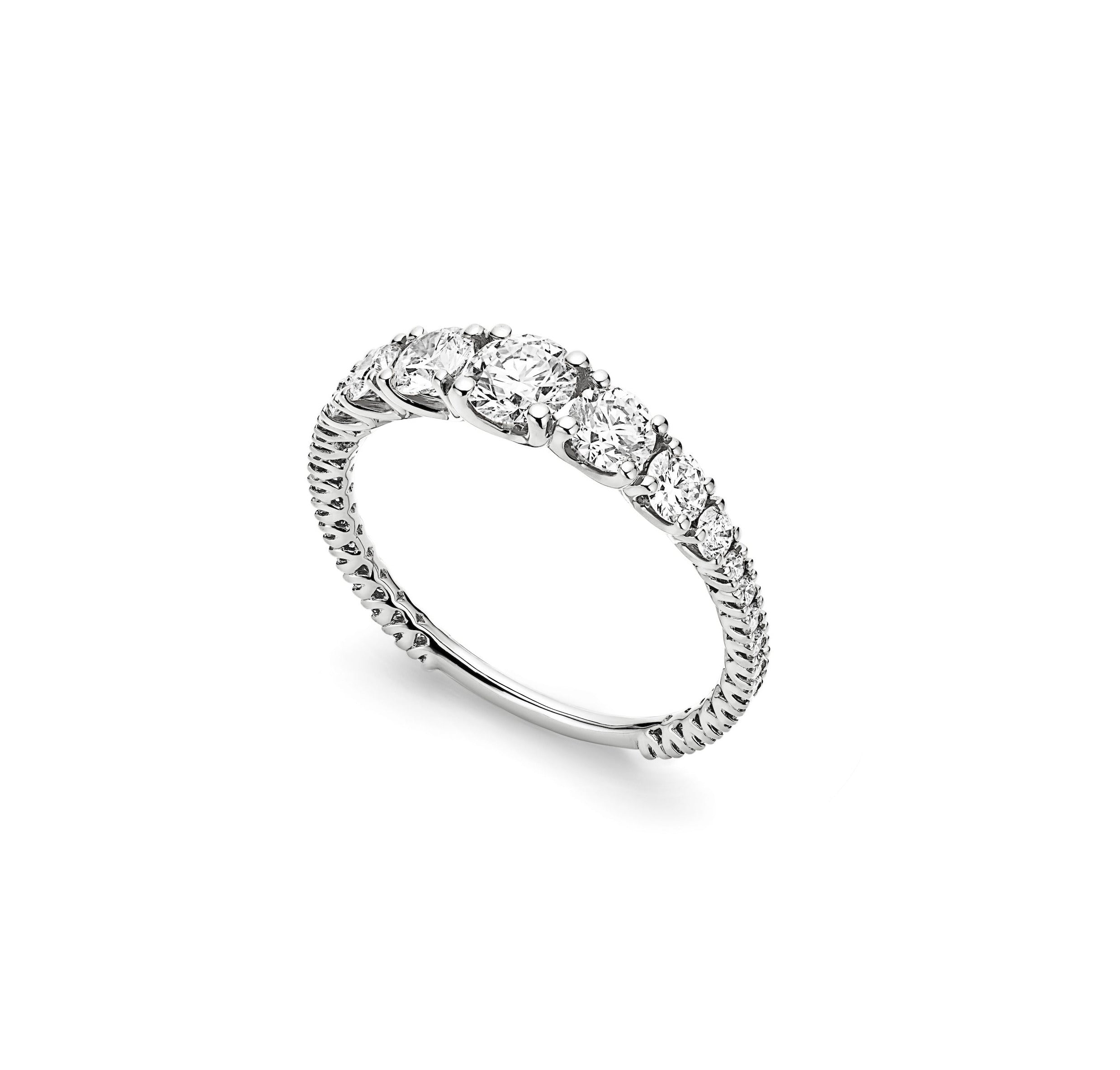 Degradé Diamond Eternity Band An elegant eternity band featuring natural round brilliant diamonds that gracefully graduate in size, creating a soft, flowing sparkle across the finger. Timeless yet contemporary, its refined silhouette enhances brilliance while offering a delicate, sophisticated look for everyday luxury.